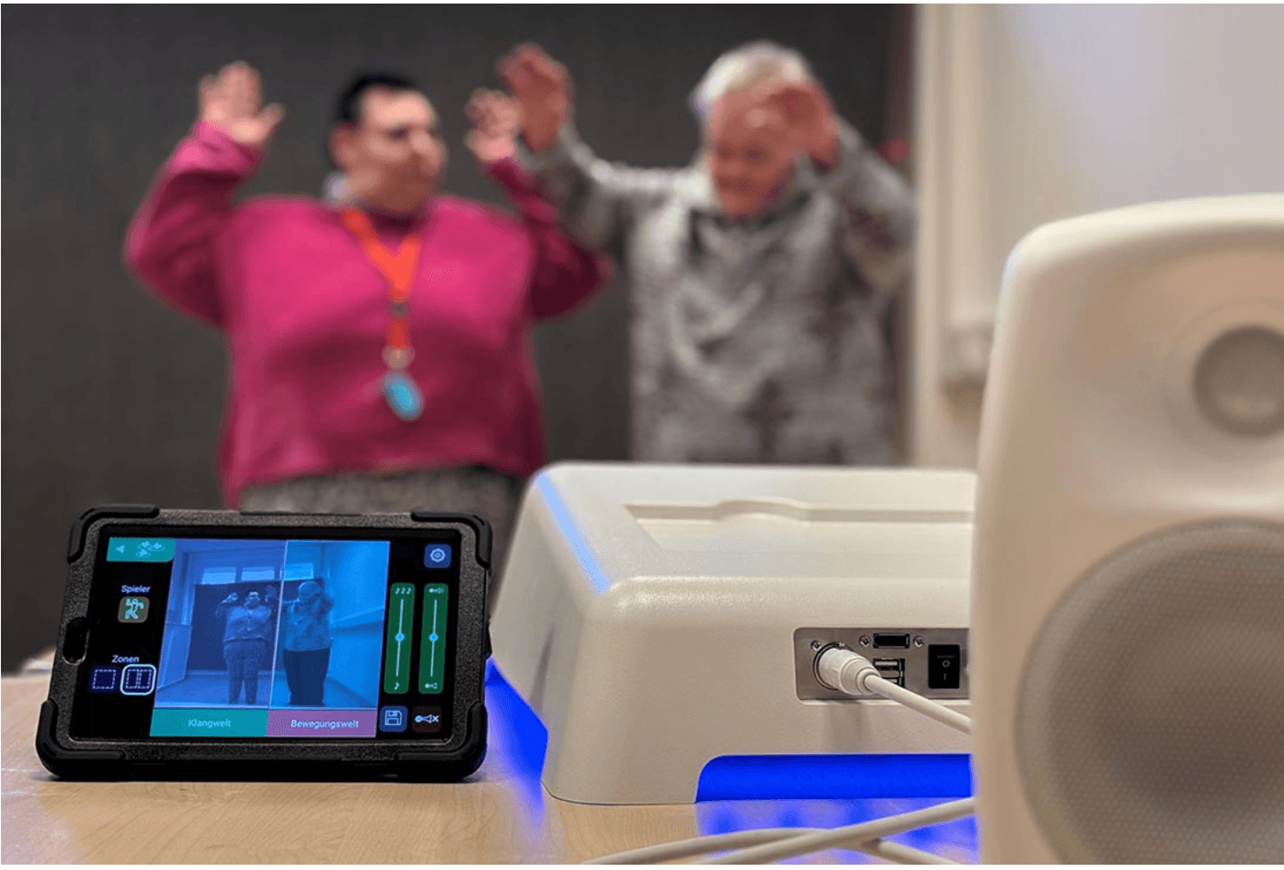 Wir benutzen den MotionComposer meist mit einzelnen Kindern, teilweise auch zu Zweit (z.B. mit Geschwisterkindern oder Freunden). Ein oder beide Elternteile oder Bezugspersonen sind natürlich immer dabei. Wir sind von unserer Seite immer zu Zweit, so dass ein Behandler mit dem Kind/der Familie interagieren kann und der zweite Behandler den MotionComposer bzw. das Tablet bedienen kann.